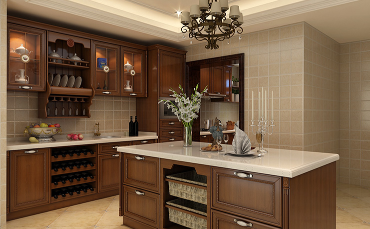 中式典雅落地櫥柜門板與臺面采用撞色設計,一深一淺對比鮮明,傳達東方禪韻;石英石臺面硬度高、韌性強、油漬污漬一抹就干凈,烹飪更省心。
